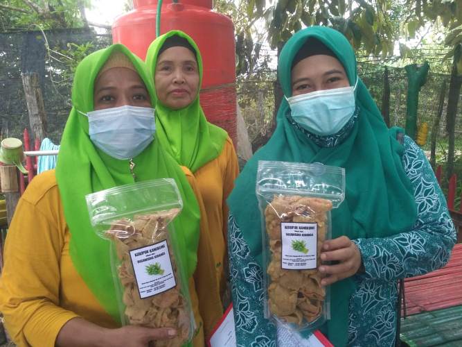(Ketua Dasa Wisma Kenanga dan Ketua PKK Desa Batuah Perlihatkan Produk Kerupuk Kangkung)