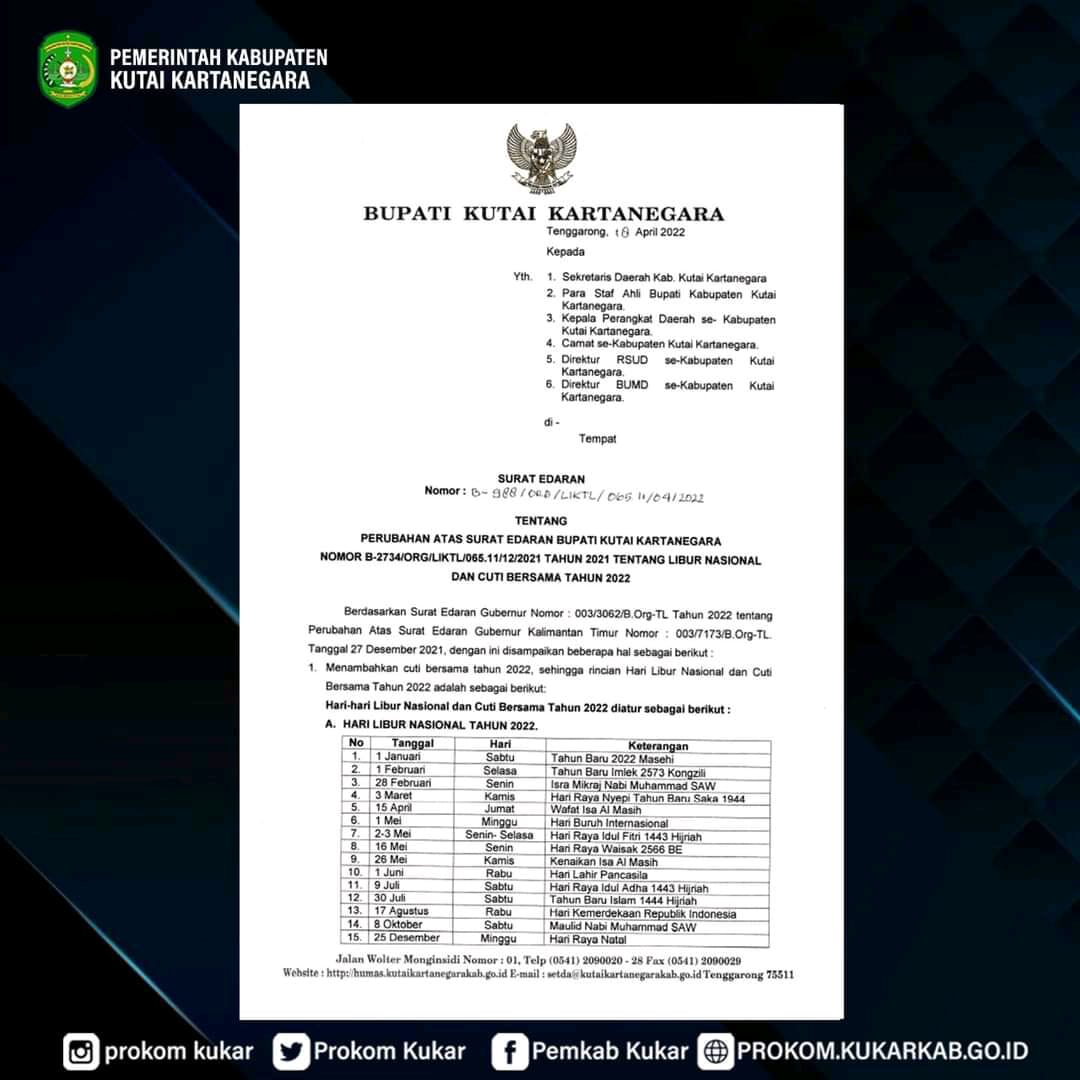 Berdasarkan Surat Edaran Nomor B-988/ORG/LIKTL/065.11/0412022 Tentang Perubahan Atas Surat Edaran Bupati Kutai Kartanegara Nomor 8.273/ORG/LIKTUO/65.11 11212021 Tahun 2021 Tentang Libur Nasional Dan Cuti Bersama Tahun 2022.