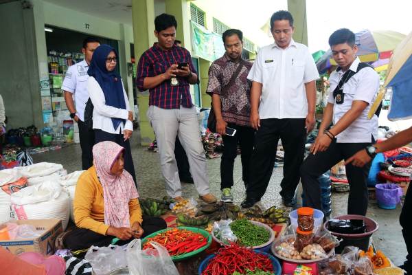 Rombongan melakukan pengecekan sejumlah harga kebutuhan pokok di Pasar Mangkurawang.