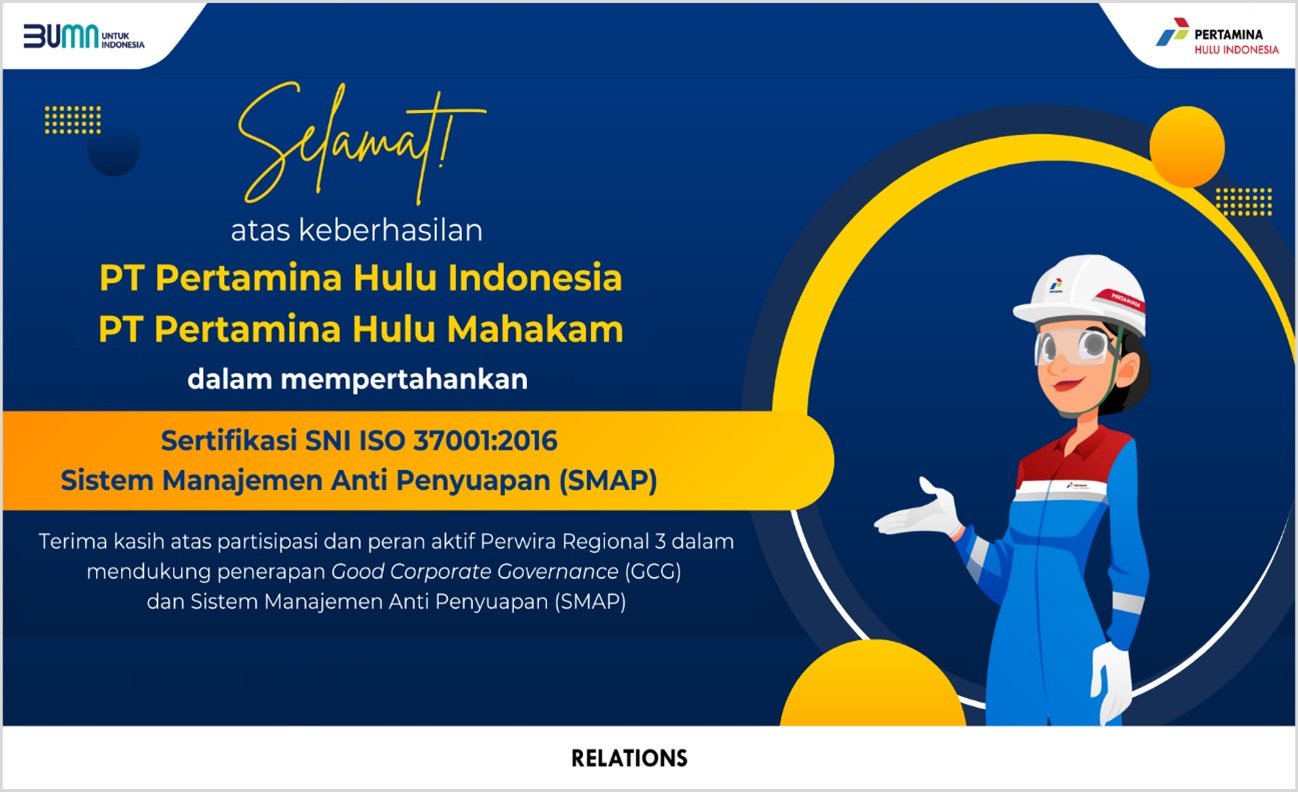 “Perusahaan telah menerapkan program anti korupsi sesuai dengan standar yang diakui secara internasional. Hal ini tentu sangat mendukung langkah perusahaan untuk mencapai visinya menjadi Perusahaan minyak dan gas bumi kelas dunia,” tegasnya.