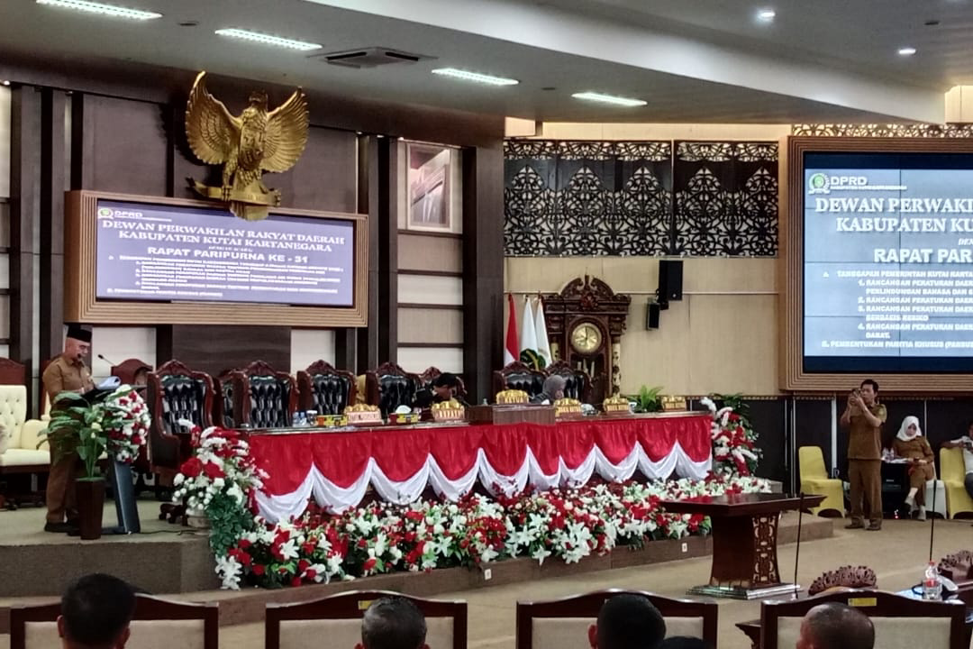 Hal ini disampaikan Asisten I Setkab Kukar Ahmad Taufik Hidayat, dalam Rapat Paripurna ke 31 DPRD Kukar, dengan agenda tanggapan Pemerintah Kutai Kartanegara terhadap 4 Raperda Inisiatif DPRD dan Pembentukan Pansus, berlangsung di Ruang Sidang Utama DPRD Kabupaten Kutai Kartanegara, Senin (9/12/2024).