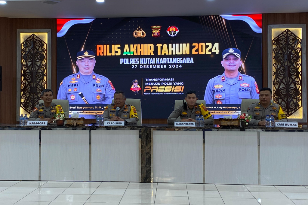 TENGGARONG, (KutaiRaya.com) Polres Kutai Kartanegara (Kukar) menggelar release akhir tahun 2024 pada Jumat (27/12/2024) di Ruang Catur Prasetya Lantai 3. Kegiatan ini dipimpin langsung oleh Kapolres Kukar, AKBP Heri Rusyaman, yang memaparkan hasil kinerja selama satu tahun terakhir.