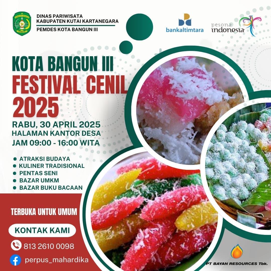 Sebagai tambahan informasi, cenil adalah salah satu makanan tradisional khas Nusantara yang kini telah menjadi bagian dari kekayaan kuliner nasional. Dengan adanya festival ini, Desa Kota Bangun III turut berkontribusi dalam pelestarian budaya lokal sekaligus memperkuat identitas kuliner Indonesia. (Dri/Adv)