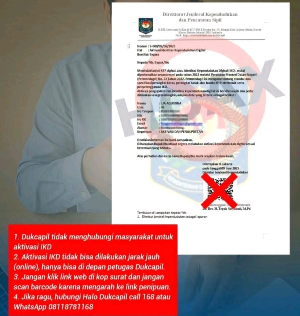 "Kami dari Dukcapil tidak pernah menghubungi warga secara pribadi baik melalui surat digital, surat fisik, atau pesan langsung untuk meminta aktivasi IKD," jelas Iryanto.