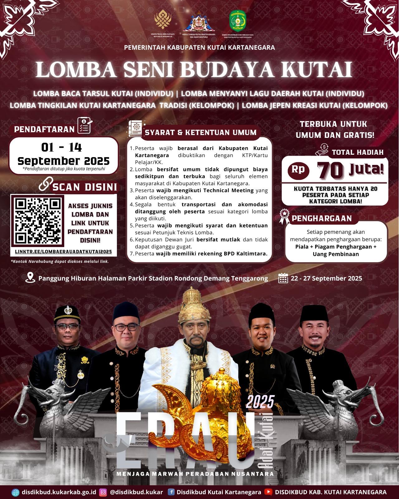 "Pada kegiatan tersebut kami mengimbau kepada masyarakat yang peduli akan seni dan budaya Kukar, seperti Tingkilan, Tarsul dan Tari Jepen. Lomba itu salah satu upaya dari pemerintah Kukar melalui Dinas Pendidikan dan Kebudayaan untuk melestarikan kebudayan yang ada di Kutai," kata Puji Senin (1/9/2025).