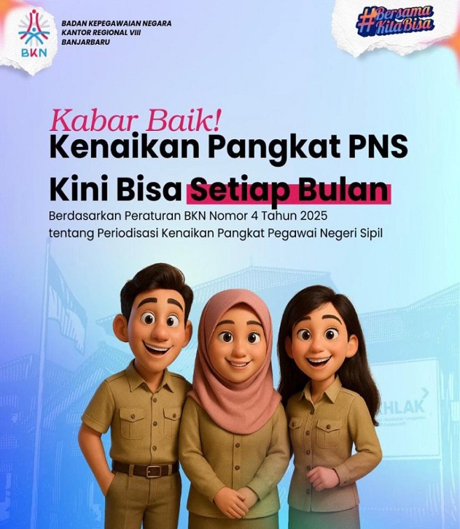 TENGGARONG, (KutaiRaya.com) Kabar baik bagi para Pegawi Negeri Sipil (PNS) yang ingin mengusulkan kenaikan pangkat. Badan Kepegawaian Negara (BKN) telah merubah kenaikan pangkat (golongan), yang sebelumnya hanya 6 bulan dalam satu tahun sekarang menjadi 12 bulan. Hal ini berdasarkan peraturan BKN nomor 4 tahun 2025 tentang periodisasi kenaikan PNS. Kebijakan ini berlaku mulai tanggal 1 Oktober 2025.