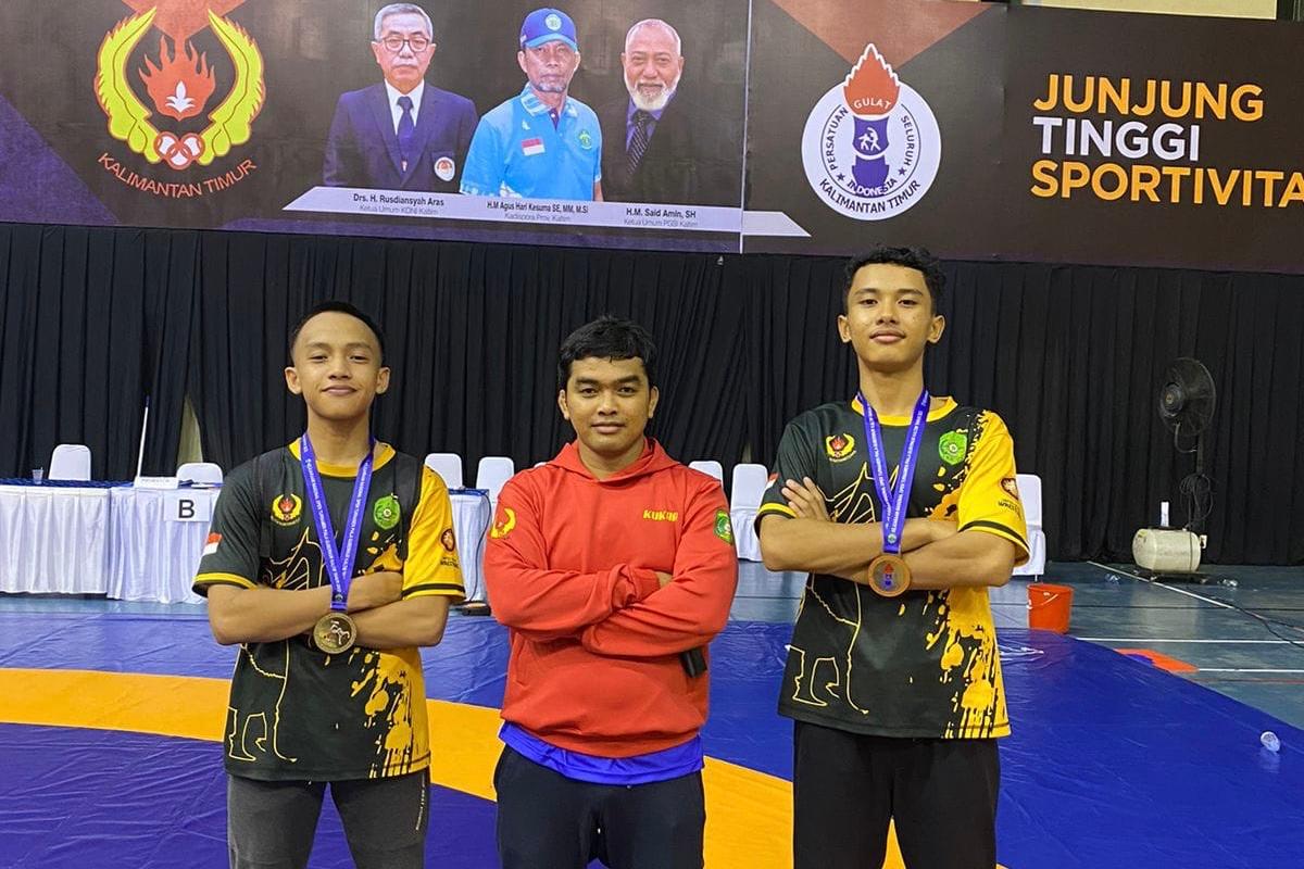 M. Juliharto (tengah) bersama kedua atletnya.(Foto:Dok Gulat Kukar)