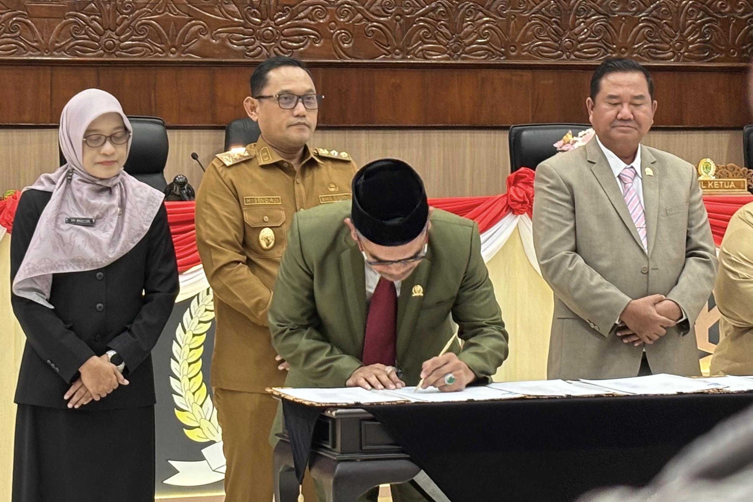 Ketua DPRD Kaltim Hasanuddin Mas’ud saat menandatangani KUA-PPAS Kaltim tahun 2026, Senin (08/09/2025).(Foto:Abi/Kutairaya)