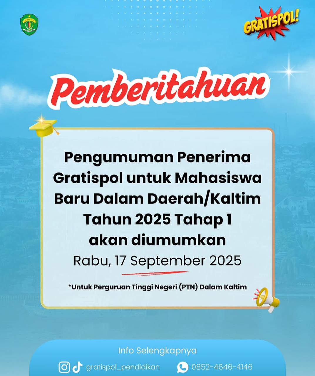 SAMARINDA, (KutaiRaya.com): Pengumuman penerima program Gratispol tahap I Pemerintah Provinsi Kalimantan Timur (Pemprov Kaltim) akan diumumkan pada Rabu (17/09/2025) besok.