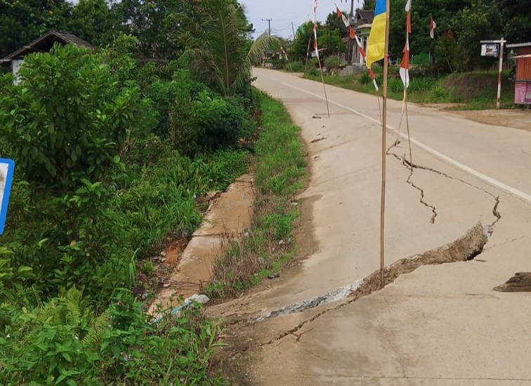 TENGGARONG, (KutaiRaya.com): Jalan poros utama Desa Margahayu, Kecamatan Loa Kulu, Kabupaten Kutai Kartanegara (Kukar) amblas.