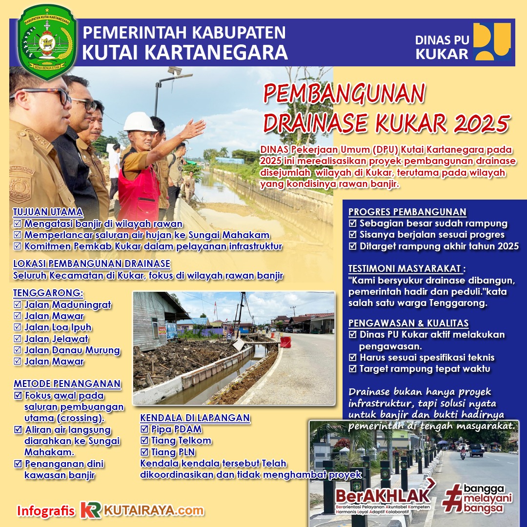 Dinas Pekerjaan Umum (DPU) Kutai Kartanegara pada 2025 ini merealisasikan proyek pembangunan drainase disejumlah sejumlah wilayah di Kukar, terutama pada wilayah yang kondisinya rawan banjir.
