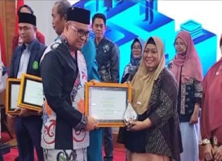 Kepala SMPN 3 Tenggarong Saat Menerima Penghargaan Anugerah Literasi Kabupaten Kukar 2025.(Andri wahyudi/kutairaya)