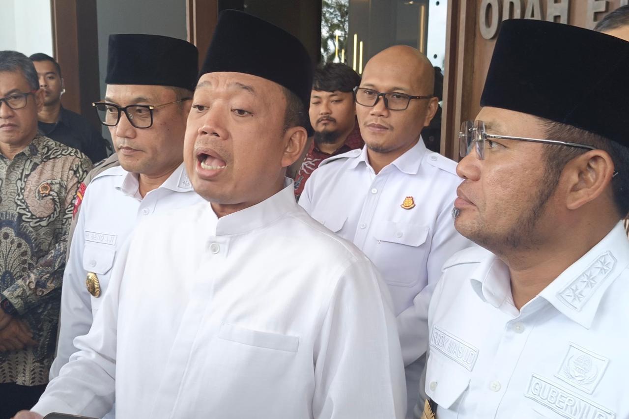 Menteri ATR/BPN Nusron Wahid saat diwawancarai oleh awak media didampingi Gubernur dan Wakil Gubernur Kaltim, Jumat (24/10/2025).(Foto:Abi/Kutairaya)
