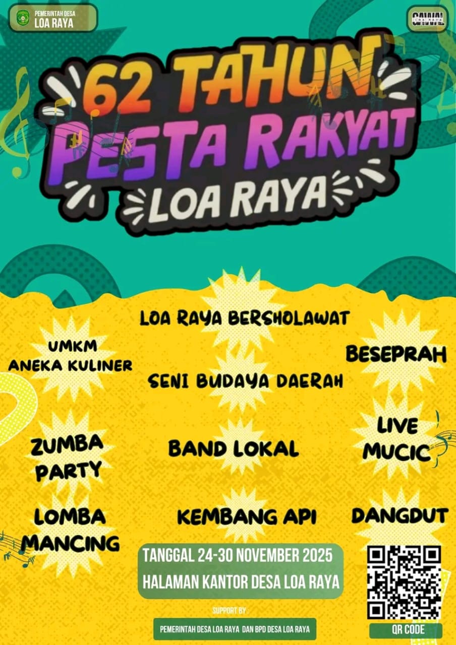 TENGGARONG, (KutaiRaya.com) : Pesta Rakyat menjadi acara HUT Desa Loa Raya yang ke 62 tahun dan akan dirayakan meriah dengan rangkaian acara selama satu pekan, dari 24-30 November 2025.