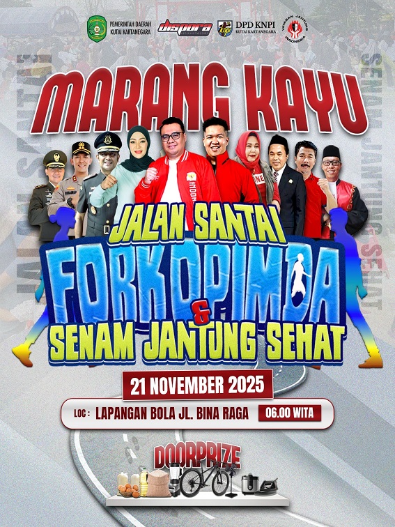 TENGGARONG, (KutaiRaya.com): Dinas Kepemudaan dan Olahraga (Dispora) Kabupaten Kutai Kartanegara kembali menggulirkan agenda olahraga massal melalui kegiatan jalan santai Forkopimda dan senam jantung sehat yang digelar di Kecamatan Marang Kayu, Jumat (21/11/2025). Lapangan Bola Jalan Bina Marga menjadi pusat aktivitas warga sejak pagi, diwarnai antusiasme masyarakat yang hadir mengikuti kegiatan.