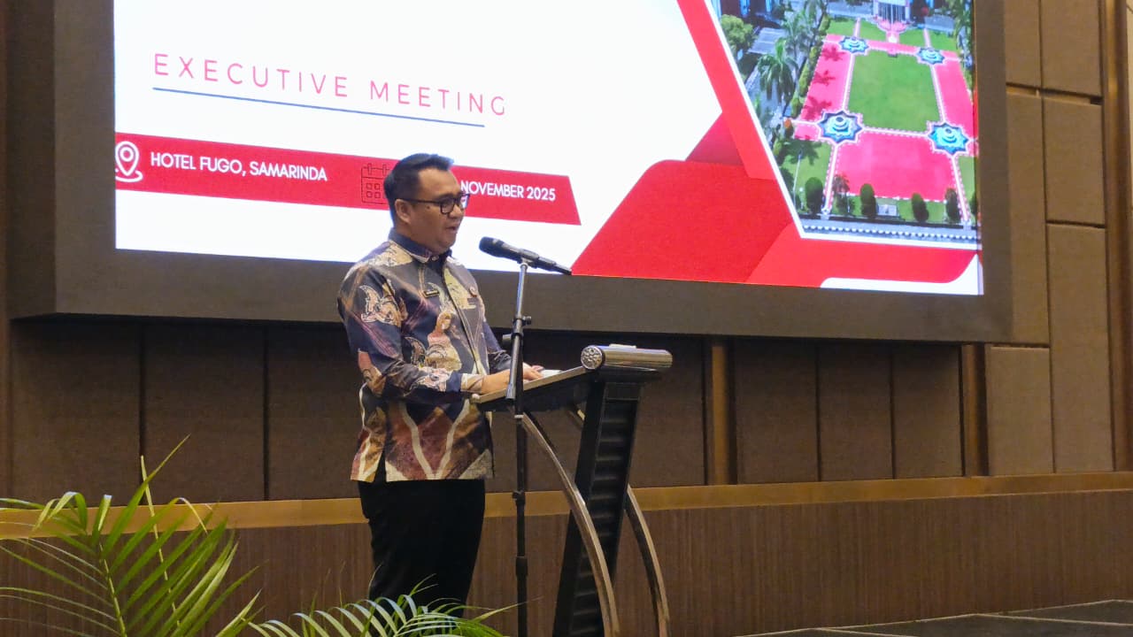 Bupati Kukar, Dr. Aulia Rahman Basri saat memberikan sambutan di agenda Silaturrahmi bersama seluruh badan usaha di Kukar. Jumat (28/11/2025).(Foto: Abi/KutaiRaya)