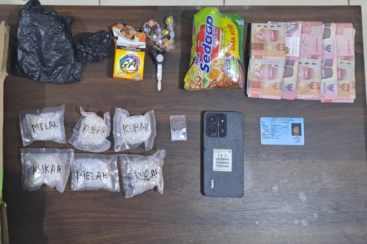 Dari hasil penggeledahan badan, kendaraan, dan barang bawaan tersangka, polisi berhasil menyita 7 bungkus sabu dengan berat kotor total 263,62 gram, serta barang bukti lainnya seperti bungkus mi instan, plastik hitam, satu unit handphone, uang tunai sebesar Rp5 juta.
