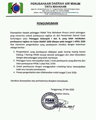 TENGGARONG (KutaiRaya.com) - Kabar gembira bagi pelanggan PDAM Tirta Mahakam khusus kelompok I dan II yang sudah membayar tagihan air bulan Maret yang telah di bayarkan 1 April 2020 uangnya akan dikembalikan mulai 2 Juni 2020.