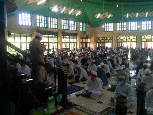 TENGGARONG (KutaiRaya.com) - Masjid Agung Sultan Sulaiman kembali melaksanakan ibadah sholat Jum'at berjamaah dengan protokol kesehatan covid-19, Jum'at (5/6), ribuan jamaah pun padati pelaksanaan sholat Jum'at pertama usai 10 pekan Masjid Agung tidak melaksanakannya.