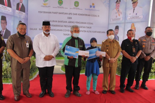 TENGGARONG (KutaiRaya.com) - Dalam rangka penanganan covid-19 di Kukar, Pemerintah Provinsi Kaltim menyerahkan paket bantuan Alat Pelindung Diri (APD) dari Kementerian Sosial RI dan penyaluran bantuan jaring pengaman sosial secara simbolis di halaman Bankaltimtara Cabang Tenggarong, Selasa (23/6).