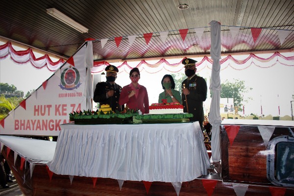 Didampingi Ketua Persit Kartika Chandra Kirana Cabang XVIII, Komandan Kodim memberikan ucapan selamat hari Bhayangkara ke- 74 Kepolisian Negara Republik Indonesia seraya memberikan tumpeng dan kue ulang tahun Bhayangkara kepada Kapolres Kukar beserta ketua Bhayangkari.