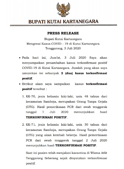 Dengan penambahan 2 pasien terkonfirmasi positif covid-19 di Kukar, maka jumlah keseluruhan pasien positif sebanyak 71, dengan 68 dinyatakan sembuh dan 3 masih dalam perawatan.