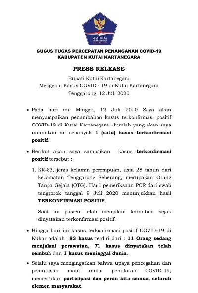 "Untuk laporan pasien positif covid-19 pada Minggu kemarin ada tambahan satu pasien Terkonfirmasi Positif Kontak Erat Kasus Sanga-Sanga KK-83 perempuan (28) dari Tenggarong Seberang, merupakan Orang Tanpa Gejala (OTG). Hasil pemeriksaan PCR dari swab tenggorok tanggal 9 Juli 2020 menunjukkan hasil terkonfirmasi positif, ""terangnya.