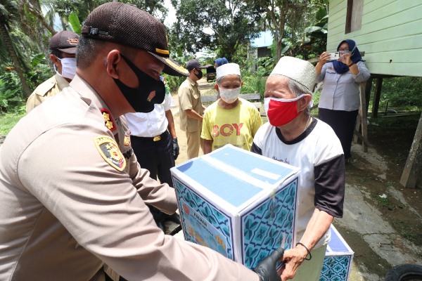 Usai menyerahkan masker kepada tokoh agama, tokoh adat dan tokoh masyarakat dilanjutkan pemberian masker kepada masyarakat di Pasar Tangga Arung dan 32 titik di enam belas Polsek jajaran Polres Kukar, sementara pembagian sembako untuk Tokoh Adat secara simbolis 10 Paket sembako dan 10 kg Beras.