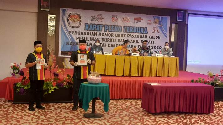 TENGGARONG (kutairaya.com) - KPU Kukar menggelar rapat pleno terbuka pengundian nomor urut pasangan calon pemilihan Bupati dan Wakil Bupati Kukar 2020 dengan penerapan protokol kesehatan covid-19 sesuai PKPU nomor 13 tahun 2020 di Hotel Grand Fatma, Kamis (24/9).