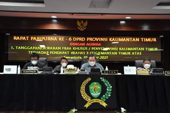 SAMARINDA (KutaiRaya.com) - DPRD Kaltim menggelar Rapat Paripurna ke-6 dengan agenda Tanggapan atau jawaban Fraksi - Fraksi DPRD Provinsi Kalimantan Timur atas Raperda Inisiatif tentang Penyelenggaraan Ketahanan Keluarga. Kemudian tanggapan atau Jawaban Gubernur Kaltim terhadap pemandangan Umum Fraksi-Fraksi tentang pembentukan Perda, pengelolaan Barang Milik Daerah dan Pembentukan Pansus.