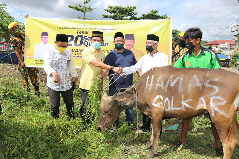 TENGGARONG (KutaiRaya.com) - Momentum Hari Raya Idul Adha 1442 H, Ketua DPD II Golkar Kabupaten Kukar H. Hassanudin Mas'ud tebar 20 ekor Sapi Qurban.