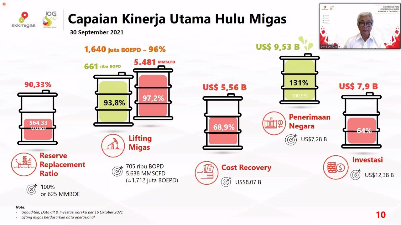 Untuk capaian lifting migas nasional per Kuartal III - 2021, Dwi menyebutkan capaian saat ini adalah 1.640 juta barel setara minyak per hari (MBOEPD) dengan rincian lifting minyak sebesar 661 ribu barel minyak per hari (BOPD), atau 93,8% dari target APBN yang ditetapkan untuk tahun ini sebesar 705 ribu BOPD. Sedangkan lifting gas sebesar 5.481 MMSCFD (standar kaki kubik per hari) dari target APBN sebesar 5.638 MMSCFD atau tercapai 97,2%.