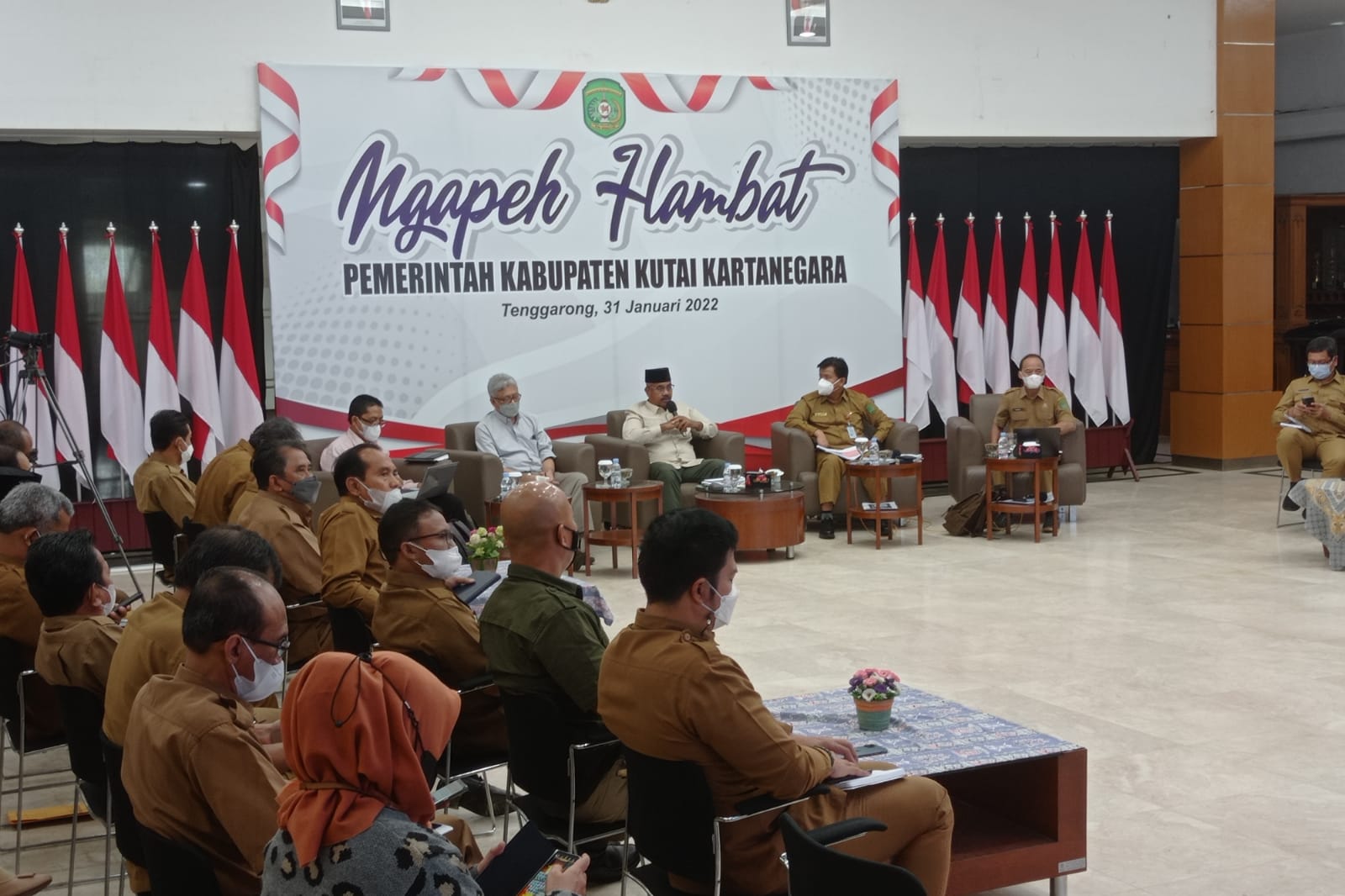 TENGGARONG, (KutaiRaya.com) Bupati Kukar Edi Damansyah menyampaikan tiga catatan penting kepada para Kepala OPD (Organisasi Perangkat Daerah) Kukar yang hadir pada acara Ngapeh Hambat, di Ruang Serbaguna Kantor Bupati Kukar Senin (31/1/2022).