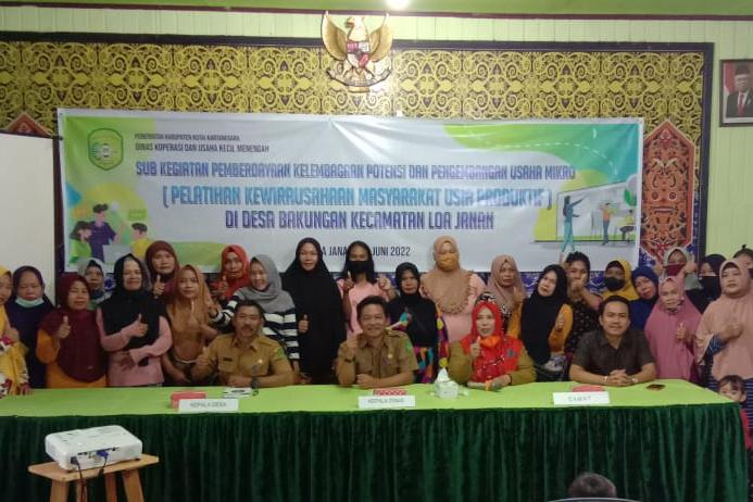 TEMGGARONG, (KutaiRaya.com) Dinas Koperasi dan Usaha Kecil Menengah (Diskopukm) Kabupaten Kutai Kartanegara menggelar kegiatan pelatihan kewirausahaan membuat makanan olahan dari bahan pisang, yang diikuti 30 peserta.,bertempat di Kantor Desa Bakungan Kecamatan Loa Janan, Selasa (14/6/2022).
