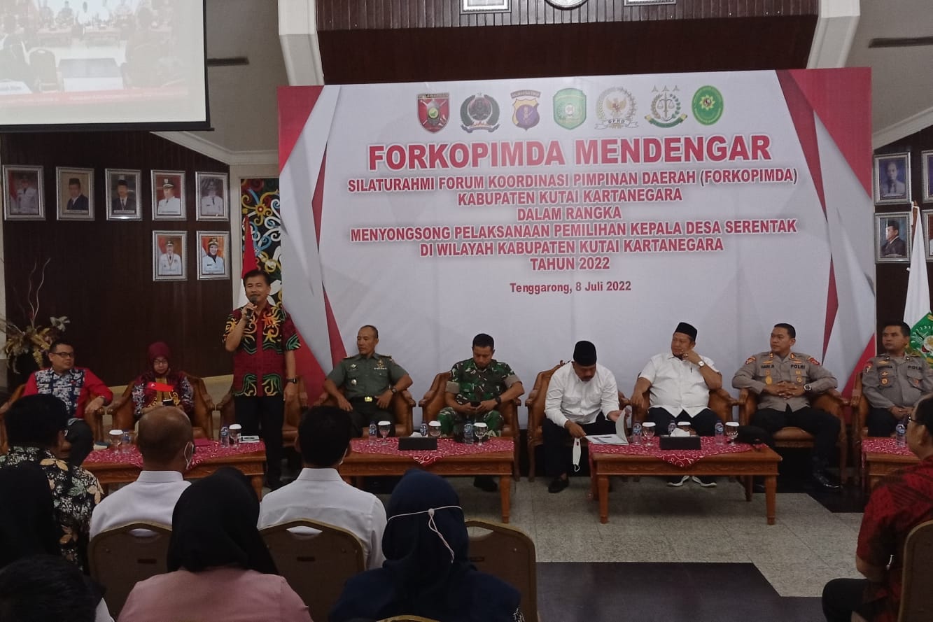 TENGGARONG, (KutaiRaya.com) Dalam rangka persiapan Pilihan Kepala Desa (Pilkades) serentak tahun 2022, Forum Kordinasi Pimpinan Daerah (Forkopimda) Kabupaten Kutai Kartanegara adakan acara silaturahmi bersama panitia pelaksana Pilkades yang ada di 86 Desa. Bertempat di Pendopo Odah Etam Jumat (8/7/2022).