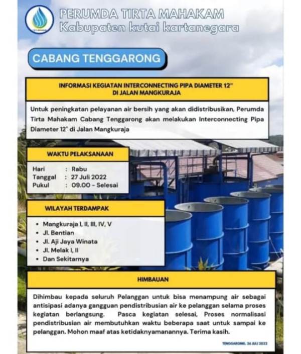 TENGGARONG, (KutaiRaya.com) Perumda Tirta Mahakam Kukar akan melakukan Interconnecting Pipa Diameter 12 di Jalan Mangkuraja. Upaya ini untuk peningkatan pelayanan air bersih yang akan didistribusikan, pada hari Rabu (27/7/22) pukul 09.00 wita sampai selesai.