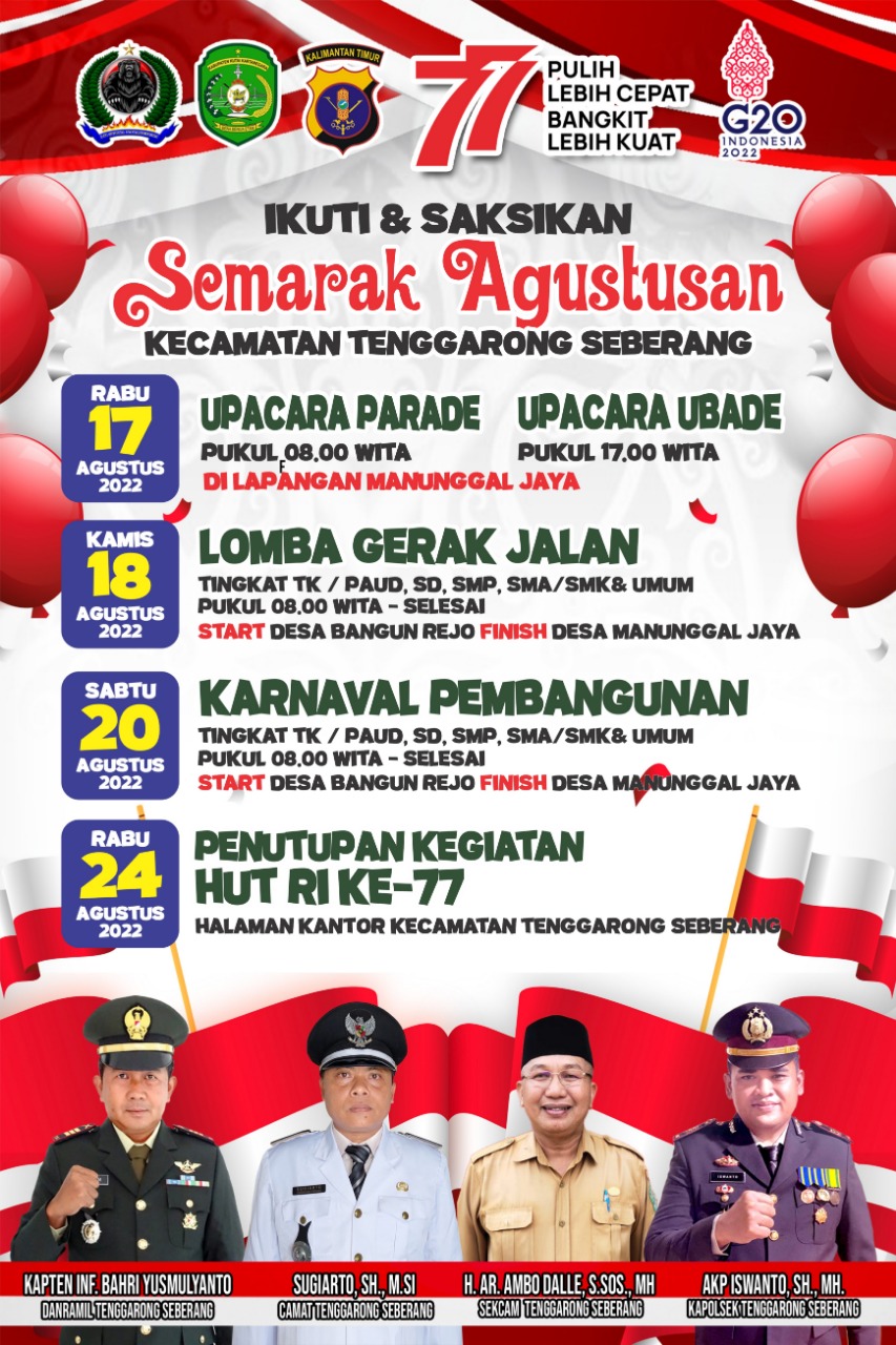 Kemudian pada 20 Agustus juga ada karnaval pembangunan yang melibatkan semua masyarakat dan semua Organisasi Perangkat Daerah (OPD) di Kecamatan Tenggarong Seberang. Dan terakhir penutupan kegiatan HUT RI ke 77 bertempat di Kentor Kecamatan.