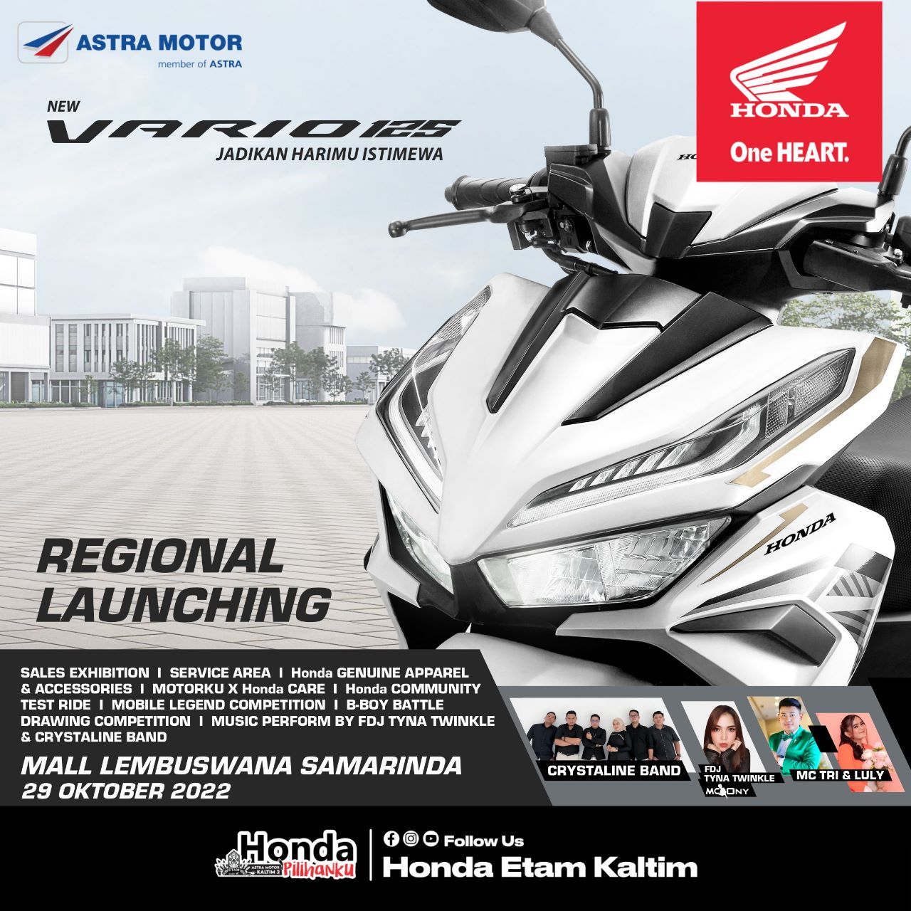 Event ini akan diramaikan dengan sederet kegiatan menarik seperti Mobile Legend Competition, B-Boy Battle Drawing & Competition serta music performance dari sederet pelaku seni lokal turut meriahkan launching ini. Tak hanya itu, Astra Motor Kaltim 2 pun telah menyiapkan ragam kegiatan lainnya seperti Sales Exhibition, Service Area, booth honda apparel & Accesories, Motorku X Honda Care & Honda Community Test Ride.