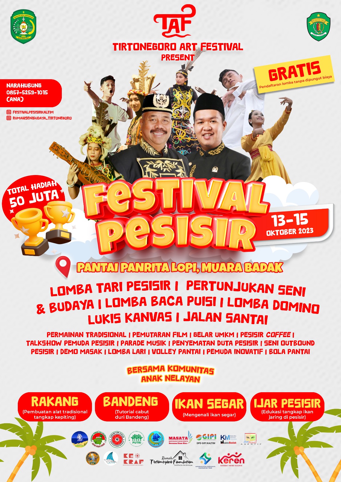 TENGGARONG, (KutaiRaya.com) Festival Pesisir 2023 akan digelar di Pantai Panrita Lopi, Kecamatan Muara Badak, Kutai Kartanegara, pada tanggal 13-15 Oktober mendatang. Event bertaraf nasional ini diselenggarakan oleh Tirtonegoro Art Festival bekerja sama dengan Pemerintah Kabupaten (Pemkab) Kukar.