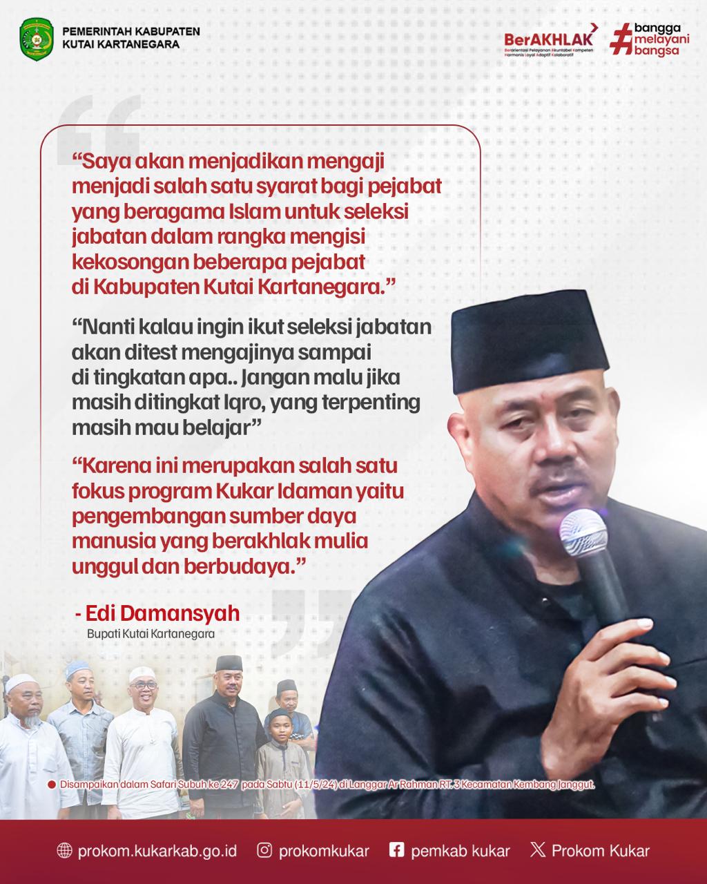 TENGGARONG (KutaiRaya.com) - Mengaji akan menjadi salah syarat seleksi Jabatan kedepannya. Hal ini diungkapkan Bupati Kutai Kartanegara Edi Damansyah saat menggelar Safari Subuh di Langgar Ar Rahman RT. 3 Kecamatan Kembang Janggut, Sabtu (11/05/2024).