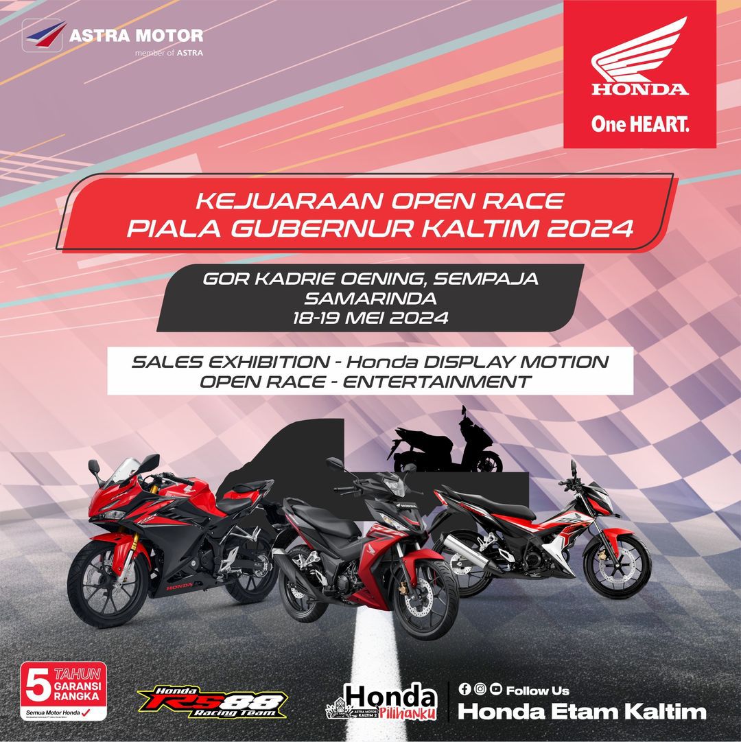 “Datang dan saksikan Kejuaraan Open Race Piala Gubernur Kaltim yang akan digelar di Sabtu dan Minggu ini. Kami telah menyiapkan pameran sepeda motor Honda yang siap memberikan kemudahan dalam melakukan pembelian sepeda motor diakhir pekan serta entertaiment menarik yang siap menghibur para pengunjung,” tutup Felix. (One)