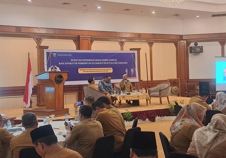 Kepala Badan Kesbangpol Kukar, Rinda Desianti, menyampaikan hal ini saat menjadi narasumber dalam kegiatan Desiminasi Manajemen Konflik Bagi Aparatur Pemerintah di Kukar. Kegiatan tersebut, yang bertema "Menjaga Kondusifitas Daerah Pasca Pemilu 2024 dan Menjelang Pilkada 2024," dilaksanakan oleh Kesbangpol Provinsi Kaltim di Hotel Grand Elty Singgasana Tenggarong pada Senin (10/6/24).