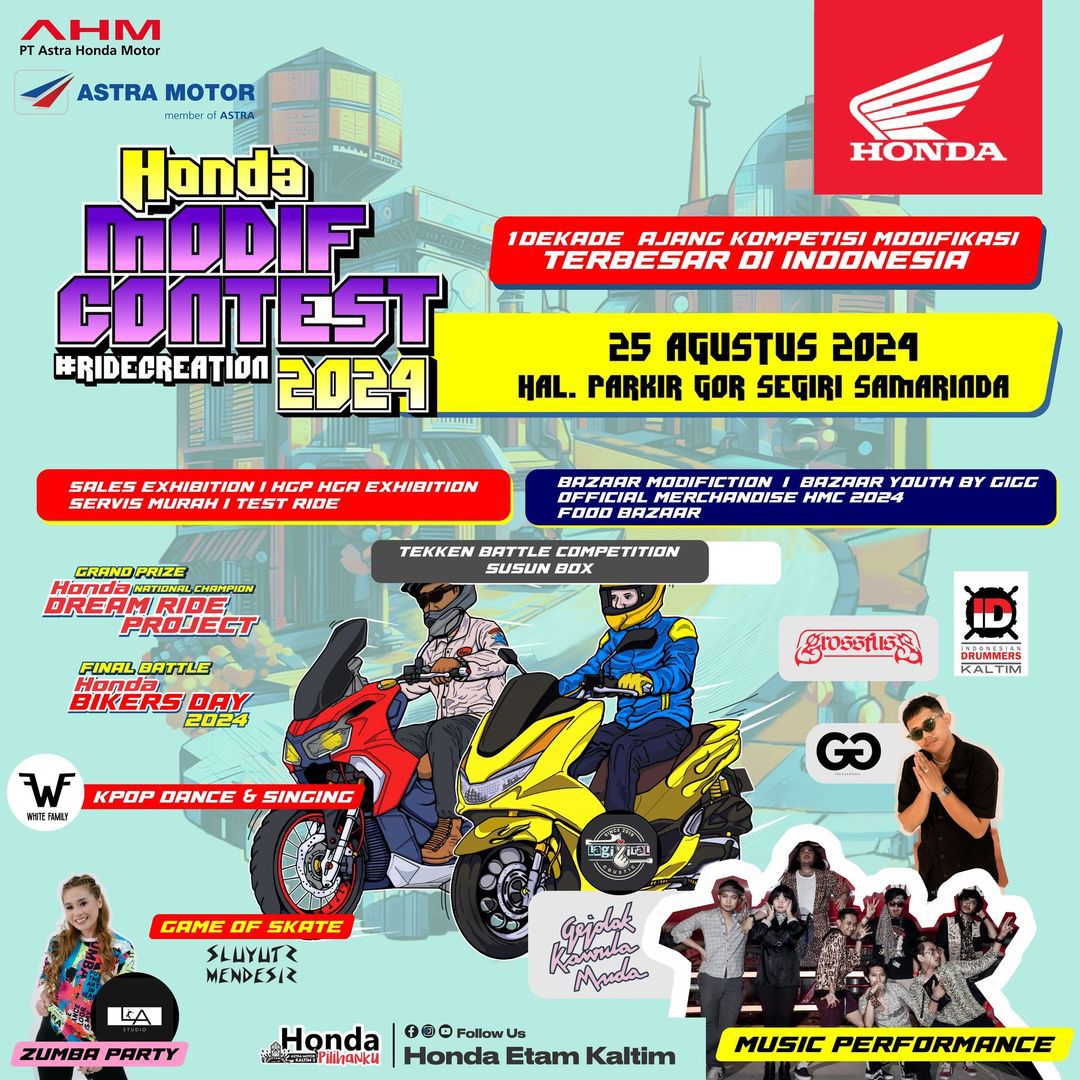 “Bagi masyarakat kota Tepian yang ingin menikmati akhir pekan bersama keluarga, jangan lupa datang dan hadiri event Honda Modif Contest (HMC) 2024 Samarinda Series pada sabtu dan minggu ini. Nikmati beragam keuntungan dan hiburan menarik yang telah kami siapkan khusus bagi para pengunjung yang pastinya tidak dipungut biaya masuk,” tambahnya.